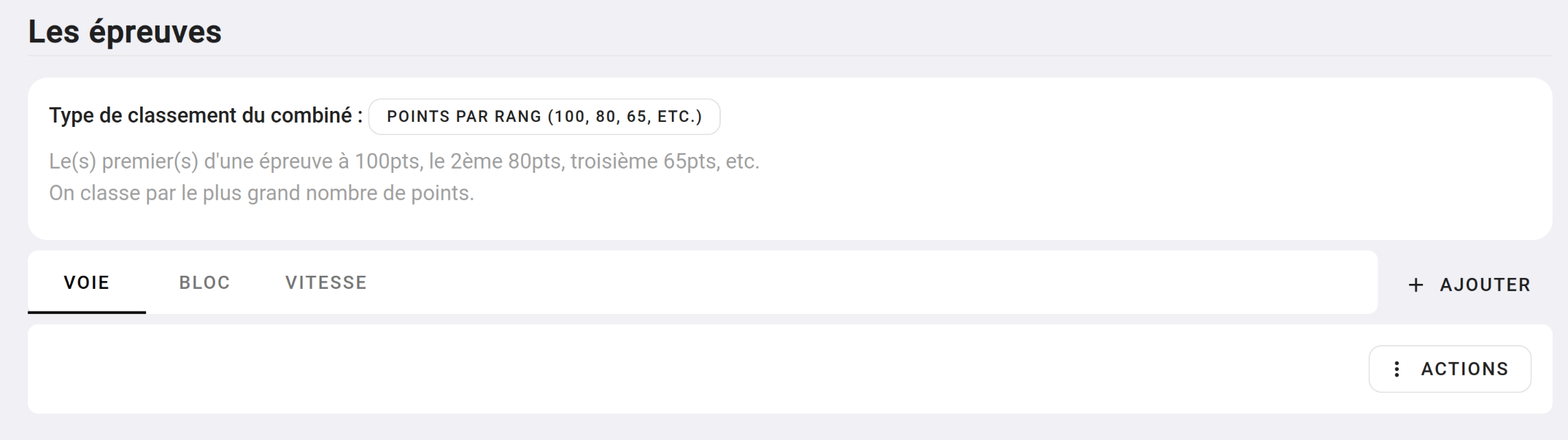 Les combinés sont constitué de 2 à X épreuves, même si habituellement un combiné est constitué de 3 épreuves : Voie + Bloc + Vitesse, rien de vous limite à ça, vous pouvez construire un combiné de 5 épreuves de bloc pour faire, par exemple, des circuits par thématique.