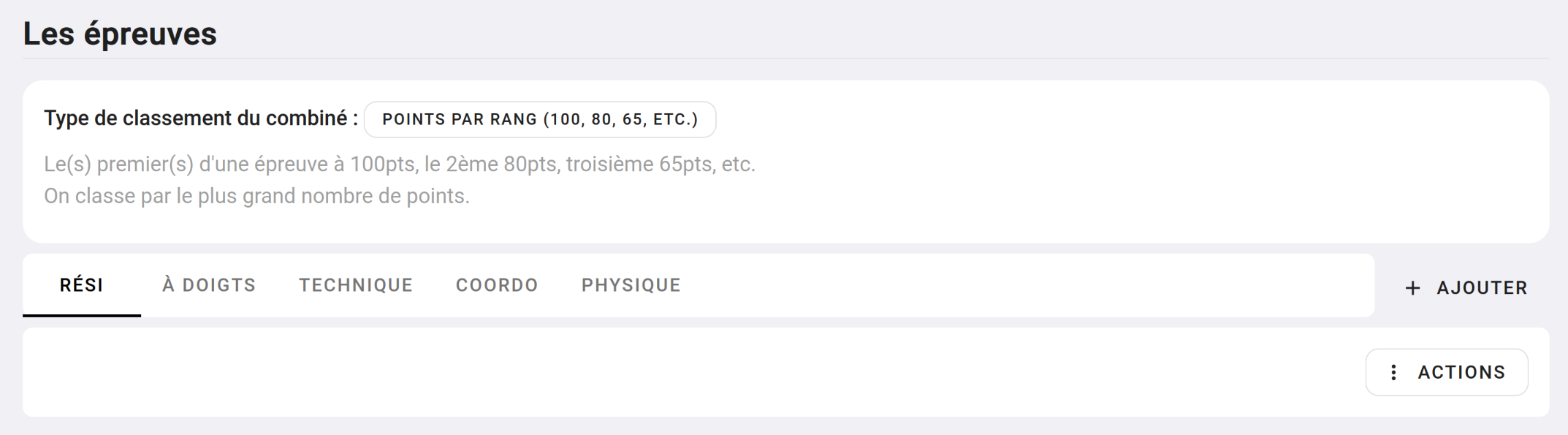 Dans chaque épreuve, vous pourrez définir une ou plusieurs étapes avec leurs propres systèmes de point et donc de classement.