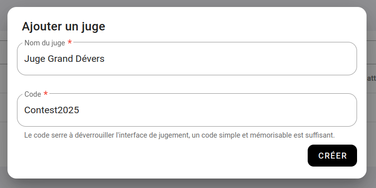 Selon l’organisation de votre contest, vous allez vouloir créer plus moins de juges, qui pourront juger plus ou moins de voies. Donner un nom de juge qui vous permet de savoir rapidement ce que le juge va faire. Si vous avez des tables avec des numéros, sur lesquelles seront installer les juges, donner par exemple comme nom “Table 1”, “Table 2”, si c’est des secteurs : “Dalle D”, “Proue”, etc.