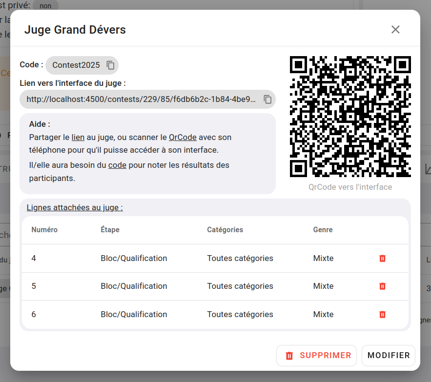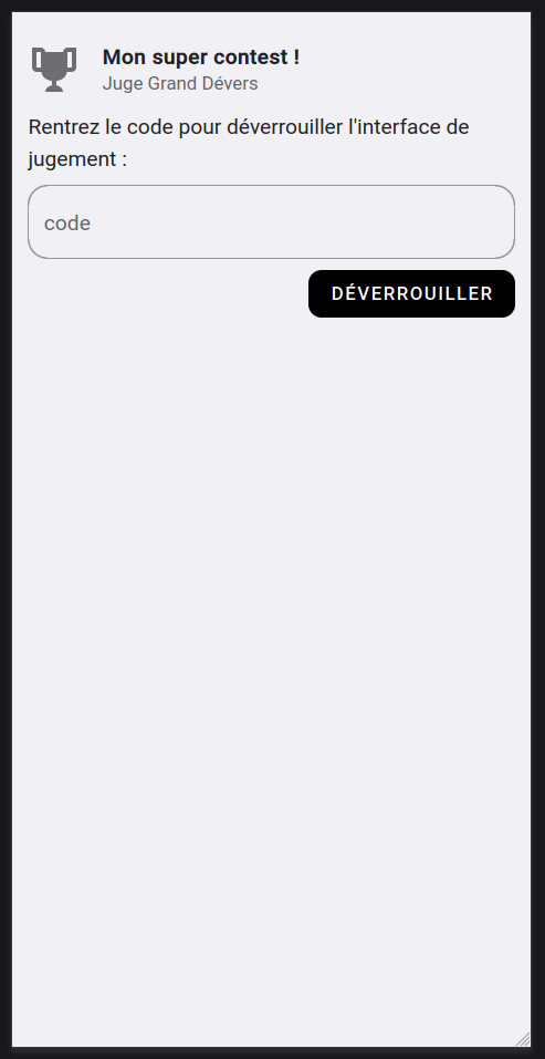 Chaque juge aura aussi un QRCode unique pour accéder à son interface. Vous pourriez imprimer ce QrCode sur une fiche scotchée à la table de jugement par exemple. Hors si vous faites ça, n’importe qui qui flasherait le QrCode accéderait à l’interface.