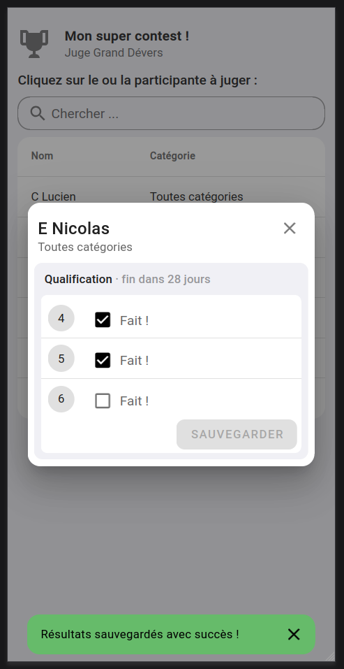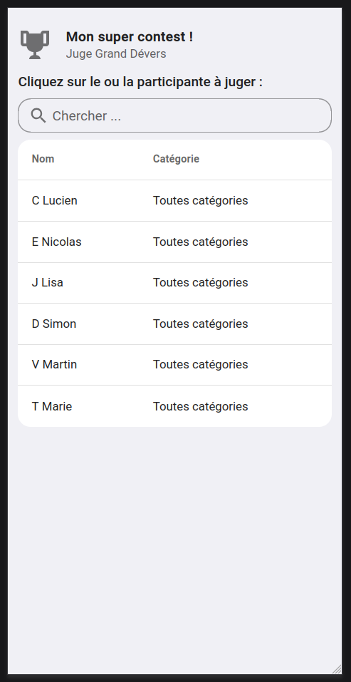 Une fois le code rentré et l’interface déverrouillée, le juge aura accès à la liste des participants qui sera amené à juger.