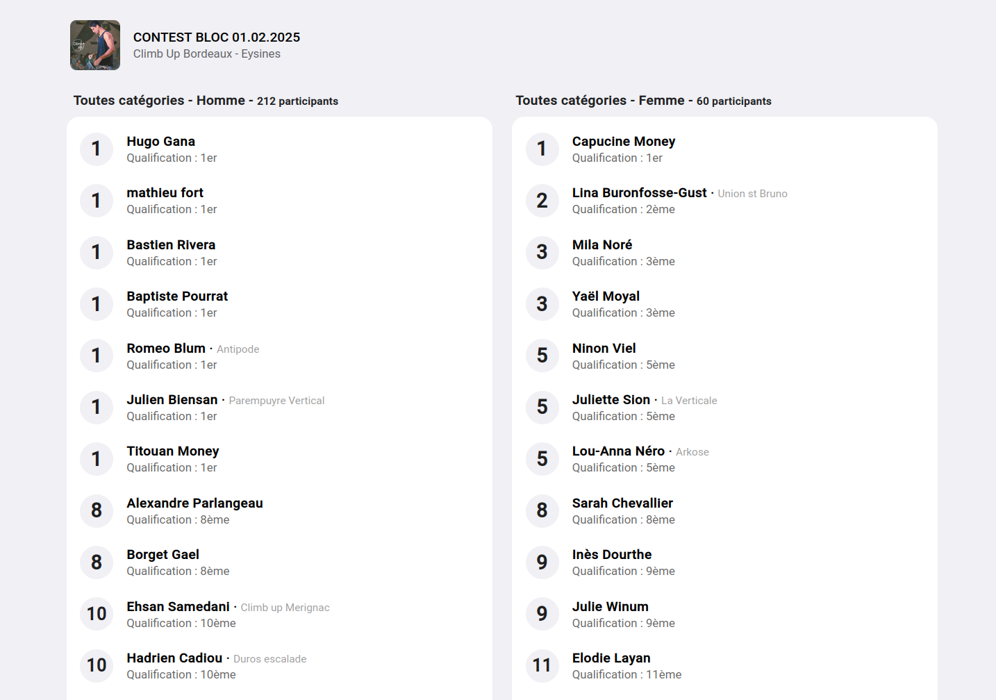 La page en directe est une page connectée en temps réel à votre contest. Chaque fois qu’un participant met à jour ses résultats, la page du classement se met à jour aussi et anime le nouveau classement de votre compétition.