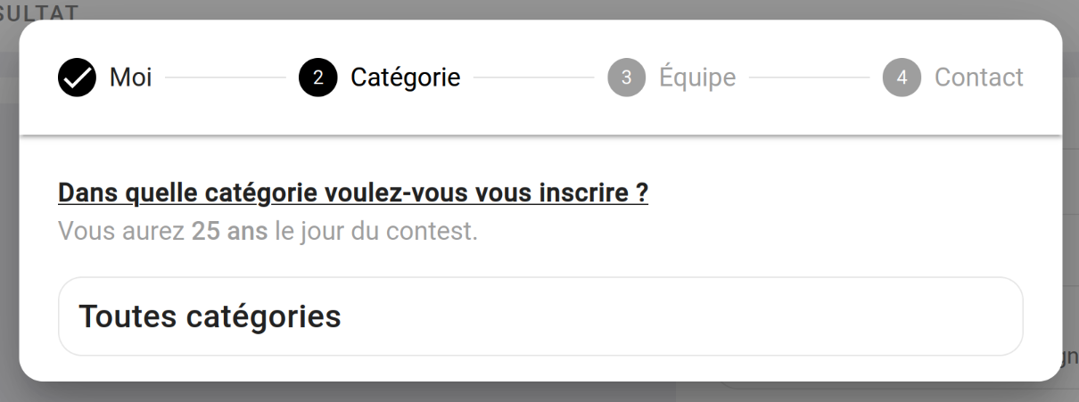Après avoir sélectionné la catégorie, le participant va arriver sur cette page :