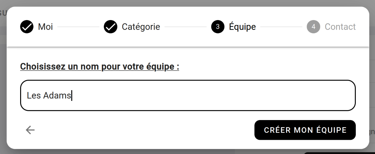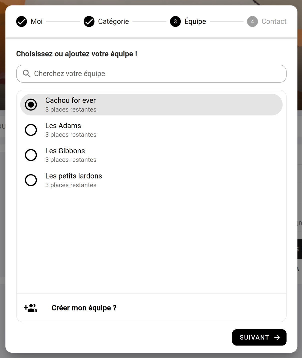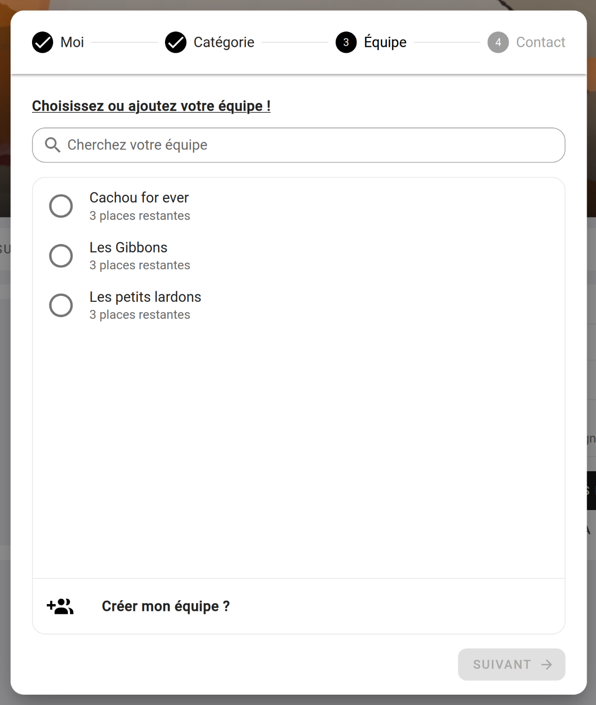 Soit le participant choisit une équipe existante, soit il crée une nouvelle équipe.