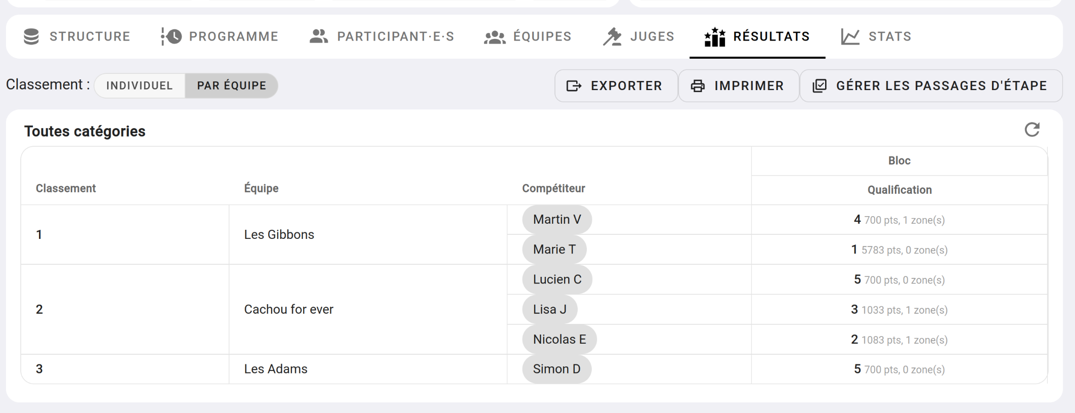 Pour classer les équipes, Oblyk fait la somme des points des participants de chaque équipe. L’équipe qui a le plus de points prend la tête !