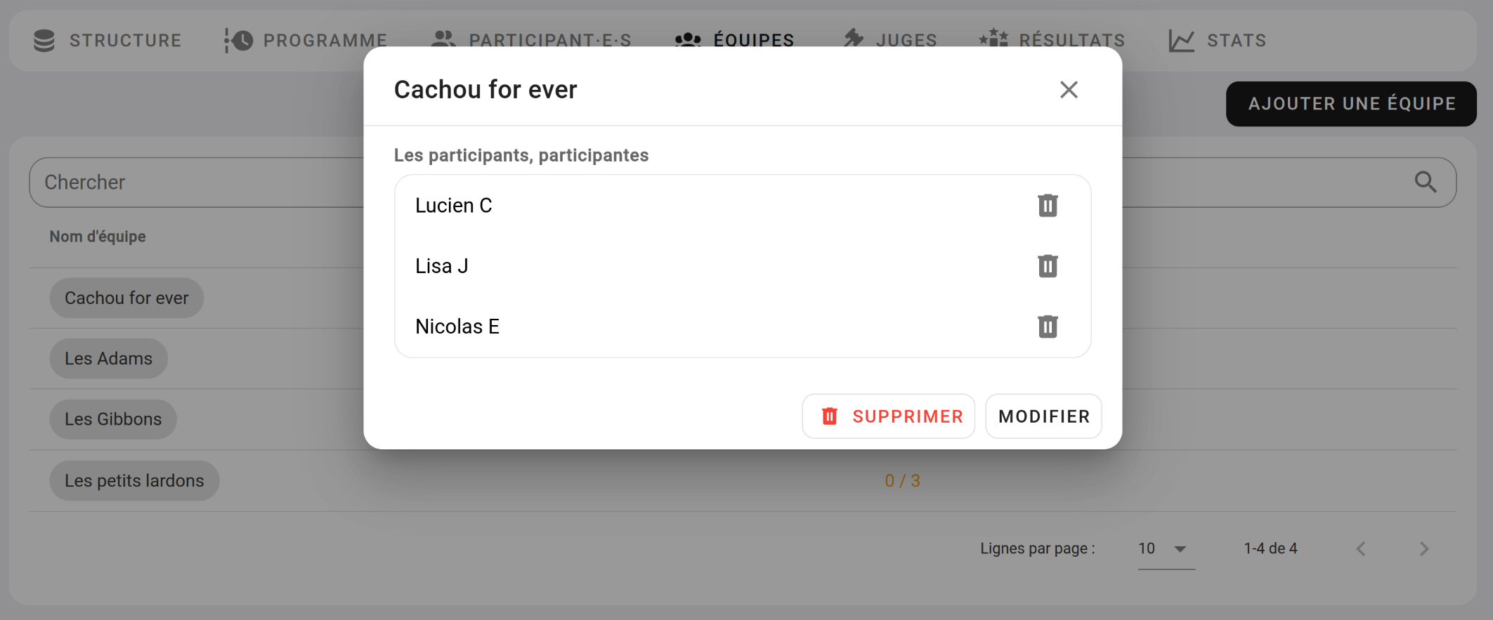 En cliquant sur une équipe, vous pouvez supprimer des participants, modifier le nom de l’équipe ou la supprimer.