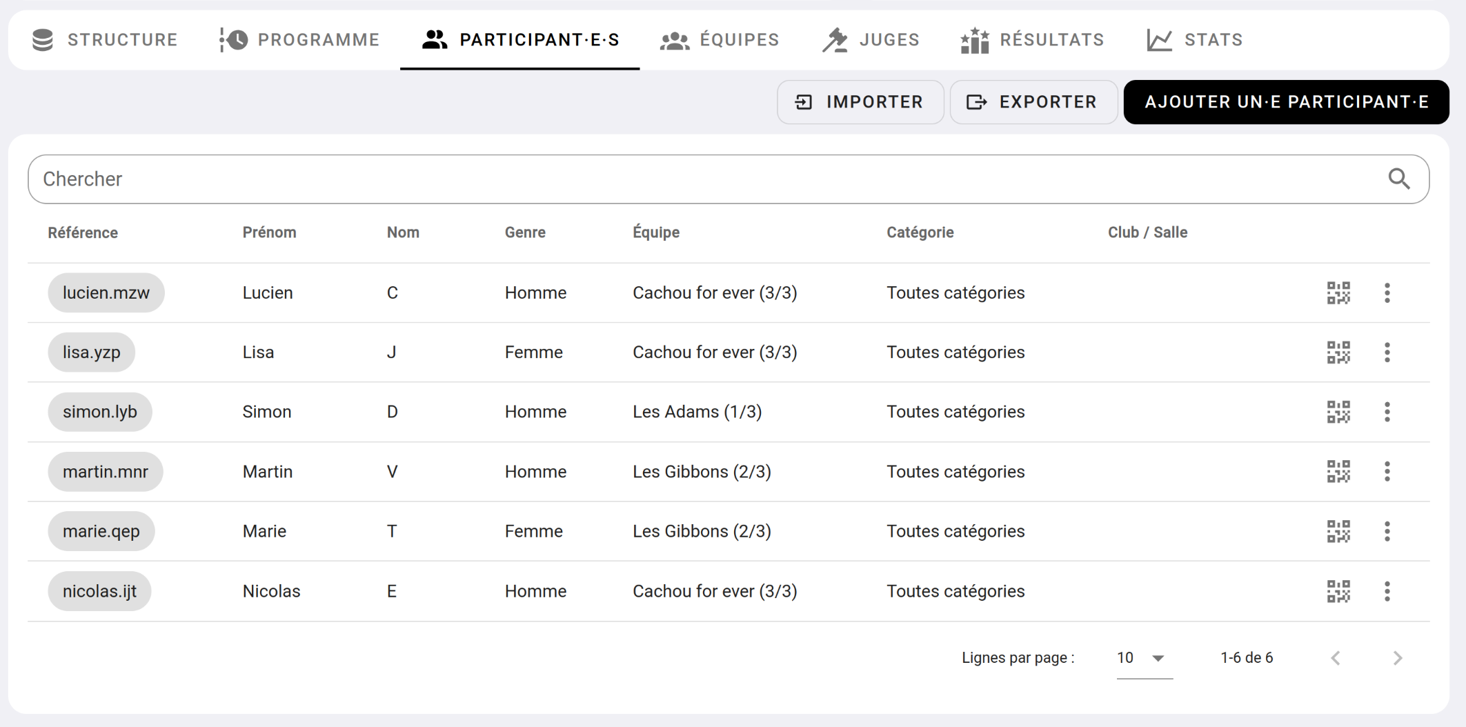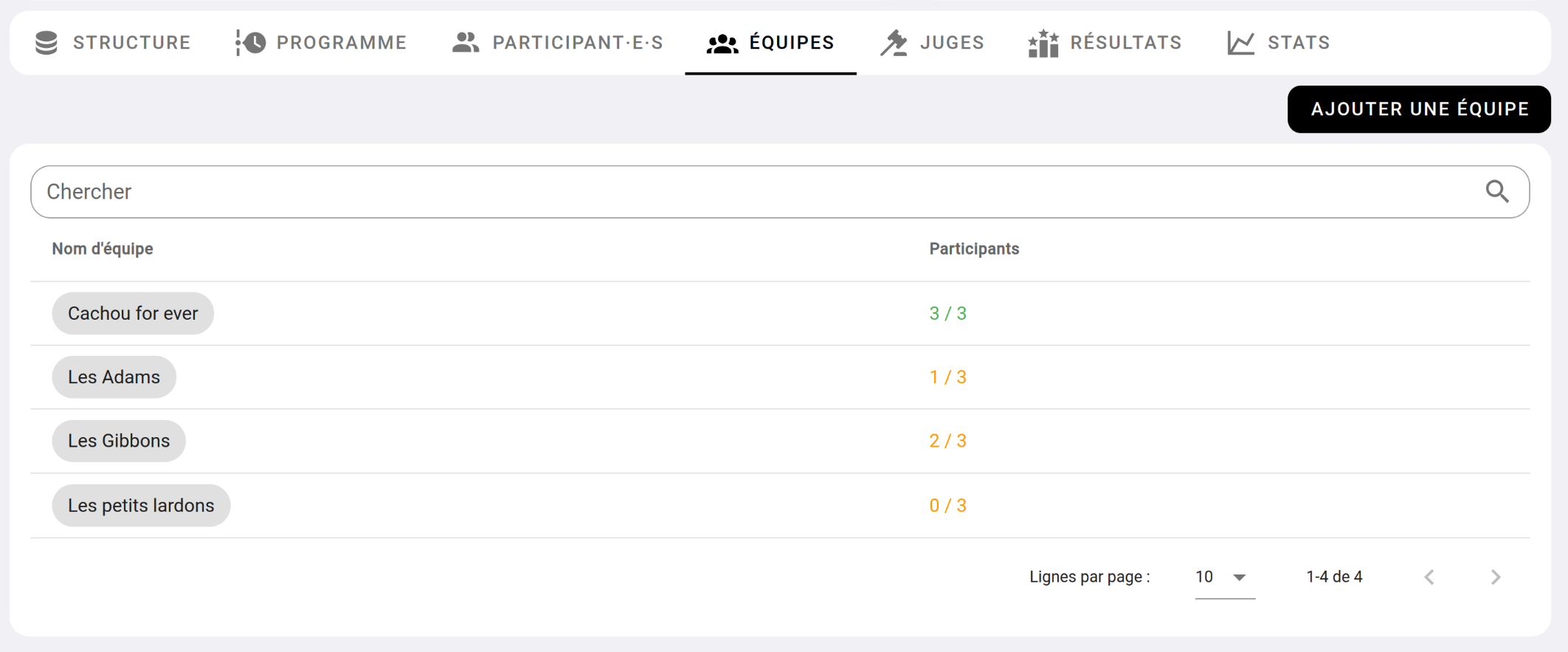 Dans l’onglet “Participant·e·s”, vous retrouverez les participants et leur équipe.