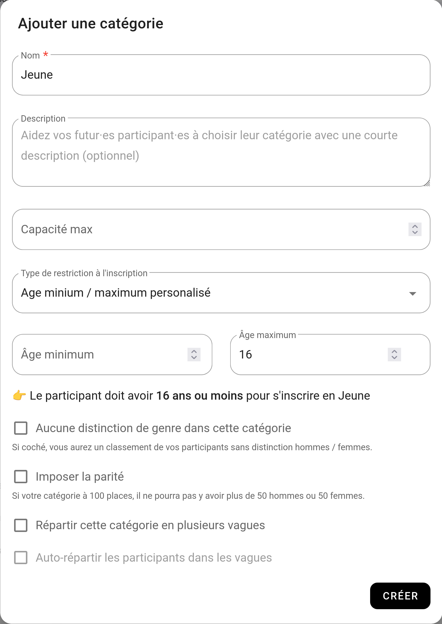 Renseignez “Jeune” dans le nom, dans “type de restriction” vous pouvez choisir “Age minium / maximum personnalisé” et renseignez 16 dans l’age maximum. Puis cliquer sur CRÉER