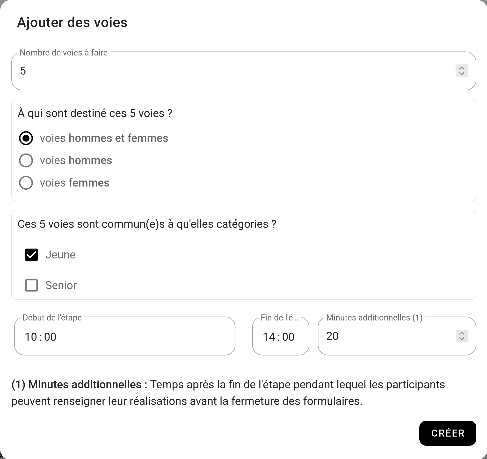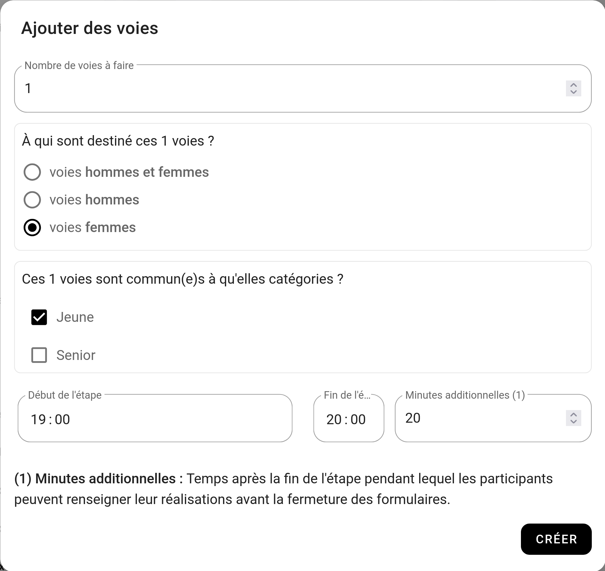 Une fois votre étape créée, on va ajouter les voies de finale. Pour ce tuto, on va imaginer qu’il y a une voie jeune femme, une voie jeune homme, une voie seniors femme et une voie seniors homme.