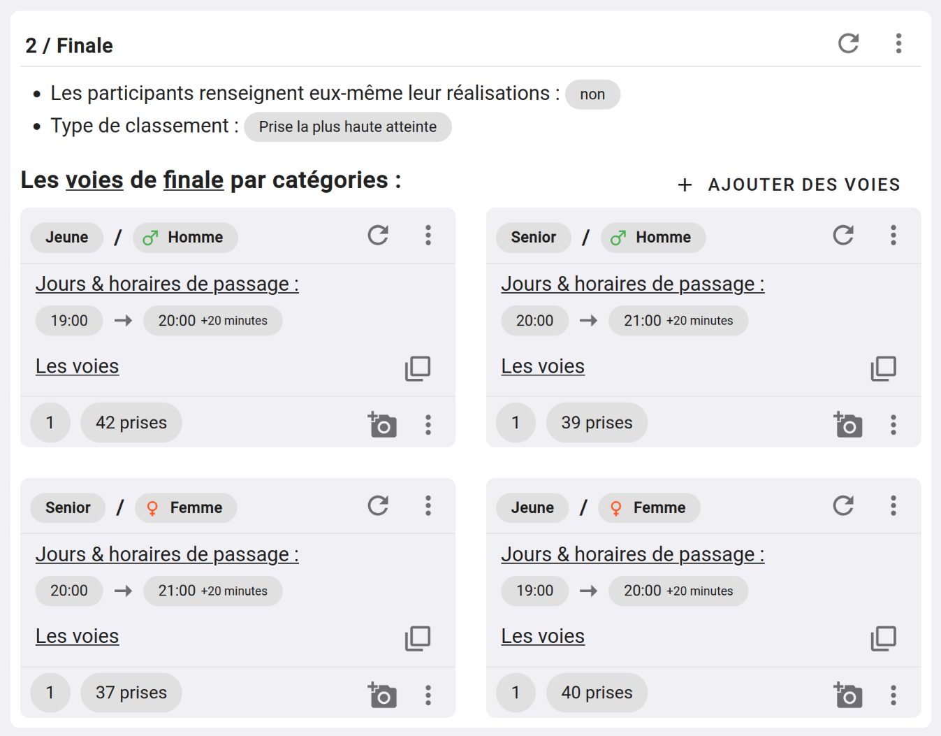 On commence par ajouter la voie jeune femme. Cliquer sur + AJOUTER DES VOIES dans le bandeau “Les voies de finale par catégories”.