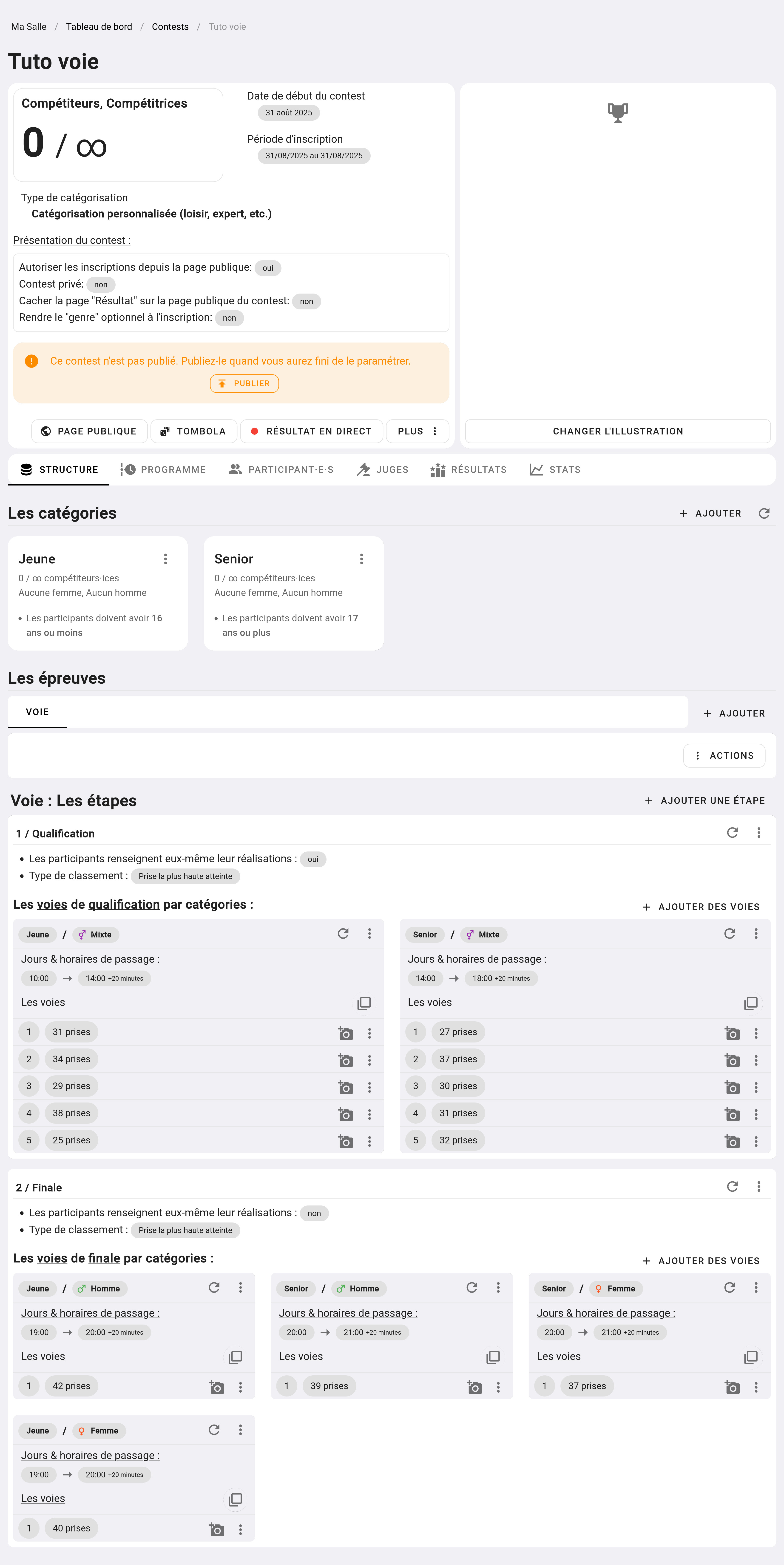 Dans ce toto, nous allons voir comment faire un contest de voie avec qualification et finale avec une catégorie Jeune et une catégorie Sénior.