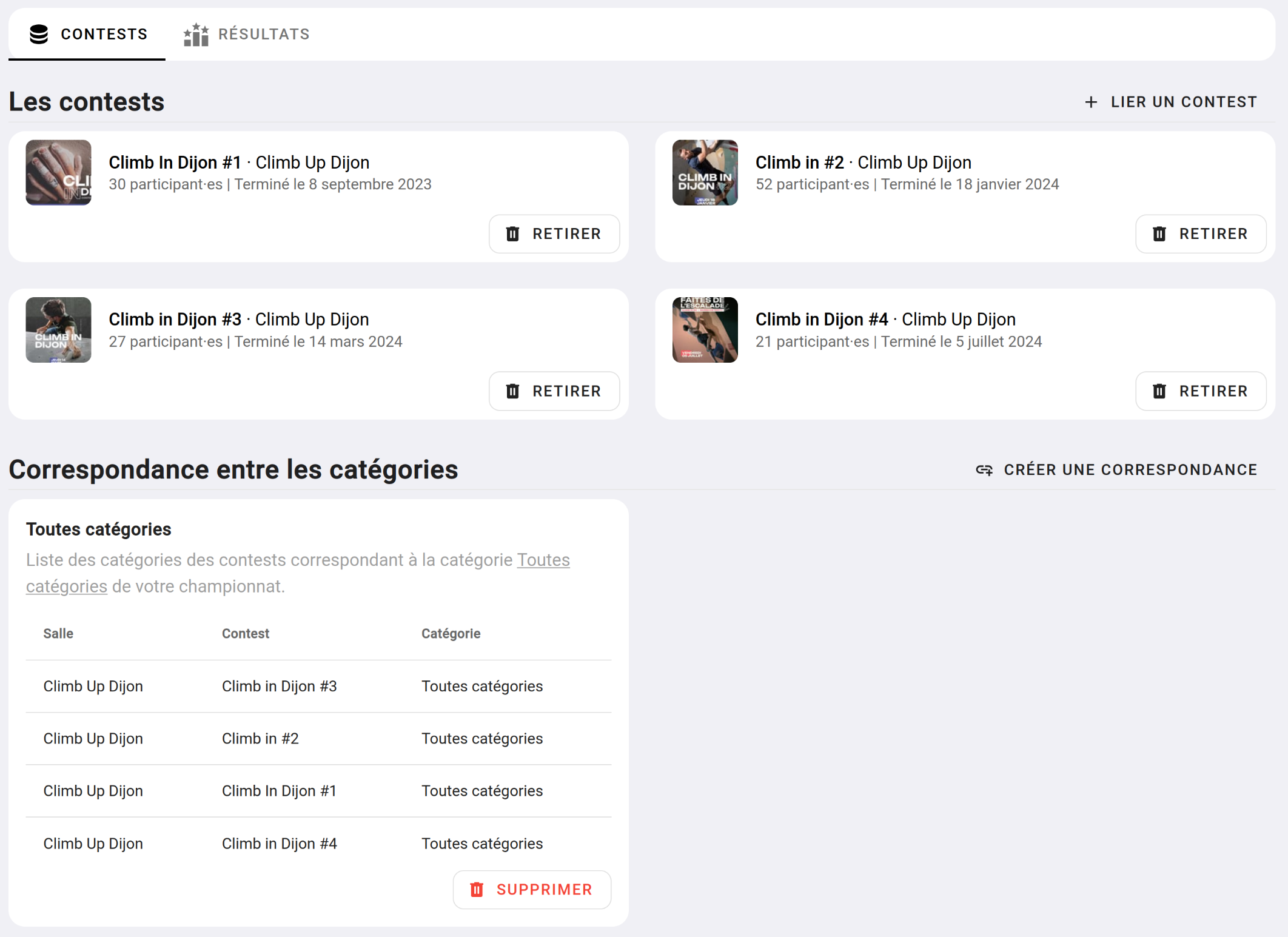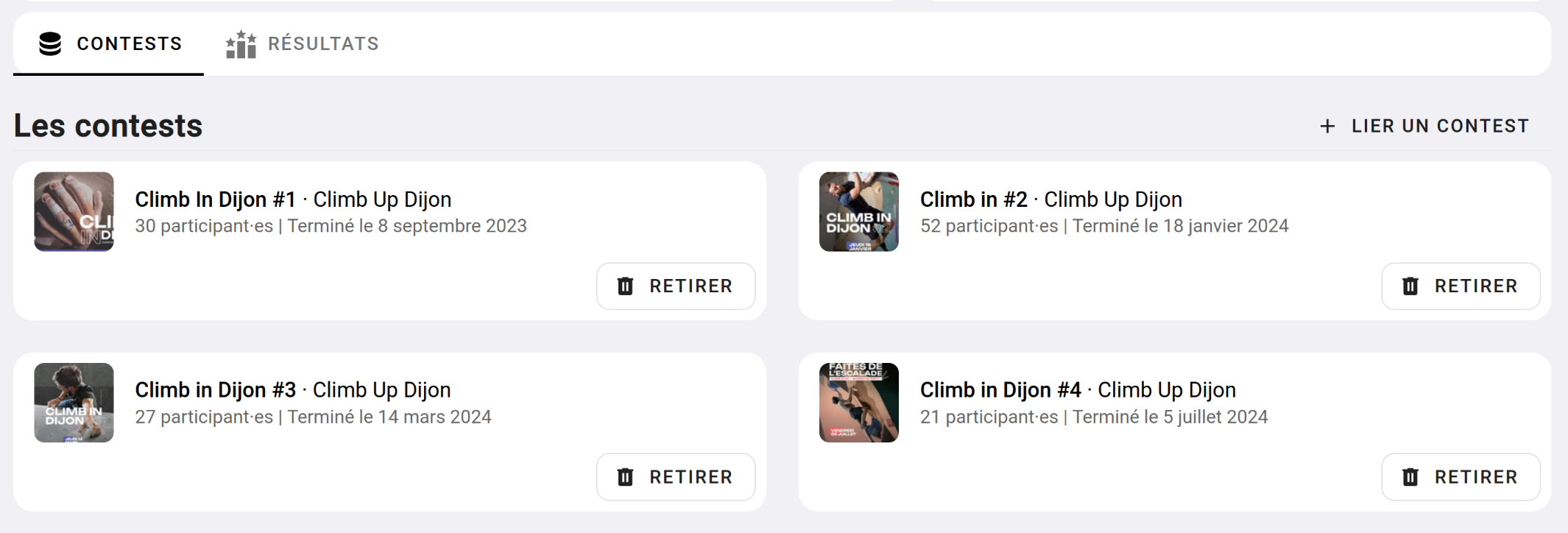 Les championnats vous permet de lier entre eux plusieurs contest que vous avez réalisé, ou que les salles de votre réseau ont fait.