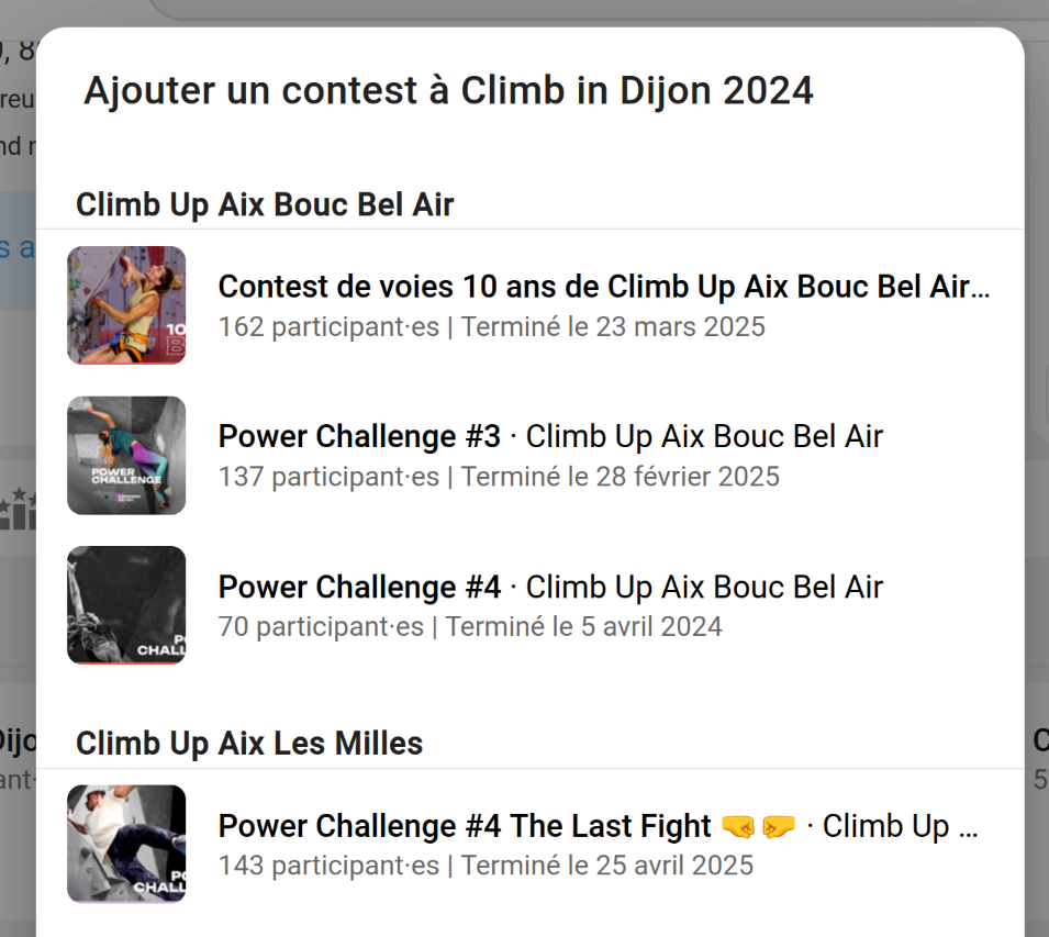 Répétez l’action jusqu’à avoir ajouté tous les contests de votre championnat.
