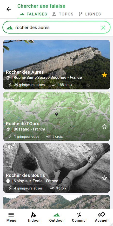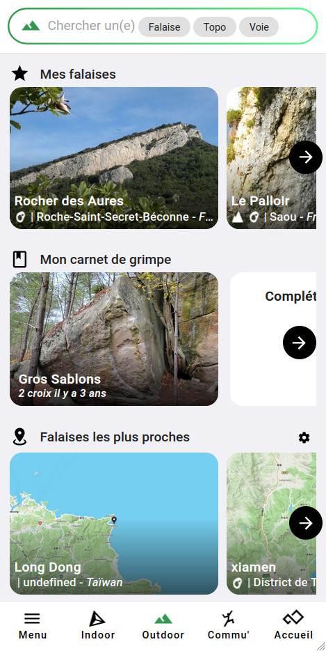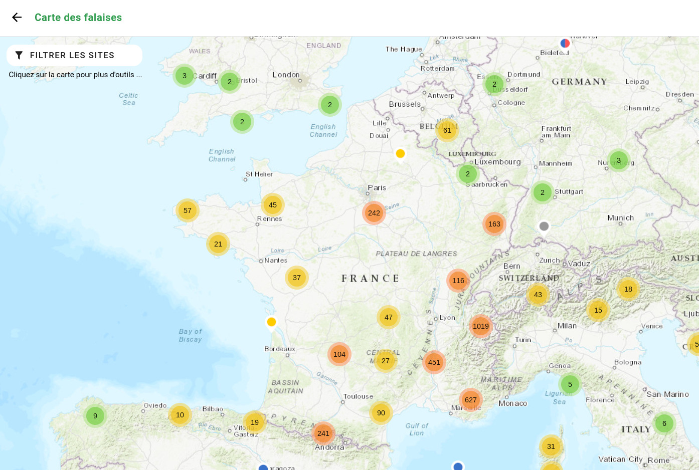 Vous pouvez trouver tous les sites d’escalade depuis la carte des falaises (accéssible depuis votre interface outdoor, ou depuis la recherche, ou dans le menu).