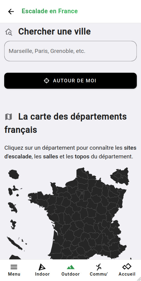 Vous pouvez chercher un site d’escalade par département, puis par ville en vous rendant à ce lien : https://oblyk.org/escalade-en/france